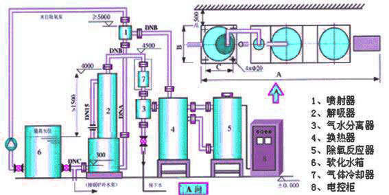 四、解析除氧器功能及應用范圍: 水中溶解氧的存在是鍋爐和熱網管道發生氧腐蝕的主要原因,進入九十年代以來,隨著水處理技術的發展,鍋爐經常在無垢或薄垢狀態下運行,這一方面極大地提高了鍋爐的熱效率,另一方面也使氧腐蝕的問題暴露出來。國家勞動部門對鍋爐氧腐蝕的危害性日益重視,關于1995年重新分布了《GB1576-95中低壓鍋爐水質標準》,規定4T/H以上的蒸汽鍋爐及水溫在95℃以上的熱水鍋爐都必須對給水除氧。解析除氧器就是為脫除水中溶解氧而設計的產品,其經濟技術及性能價格比在同類產品中居高。目前該產品已廣泛應用于熱交換站、熱水鍋爐、中壓蒸汽鍋爐以及石油化工行業工藝、冷卻設備等的給水除氧。才幫“GPT”高效脫氧反應劑對原水進行脫氧處理,除氧效率高且不改變除氧水的物理性質,可用于食品行業。 五、解析除氧器產品特點: 1、解析除氧器具有較好的余熱回收裝置,電熱反應器的溫度自動控制,節能電能。 2、JCY系列解析除氧器安裝方便,操作簡單,維護快捷,一按電鈕即可運行,設備正常運行時無須專人職守。 3、JCY系列解析除氧器運行費用低,每噸水的處理費用低于0.2元人民幣,遠低于其它除氧方式。 4、JCY系列解析除氧器結構緊湊,占地面積小,高位和低位布置均可,可大大節約土建費用和基建投資費用。 5、JCY系列解析除氧器能適應鍋爐大負荷的變化,可根據除氧水箱液面的高低實現自動運行和停止。 6、待除氧水無須加熱,在常溫下進行解析除氧,不必耗費蒸汽,可以有效增加鍋爐對外的供熱量,而且由于低溫給水入爐,有效除低鍋爐的排煙溫度,從而大大地提高了鍋爐的熱效率。 六、解析除氧器設備先進性能說明: 1、JCY系列解析除氧器對熱交換器采用了特殊的保溫技術,保證了熱交換器的溫度不會散失,很好的提高了通過解析出來的氧氣的預熱效果。 2、JCY系列解析除氧器對反應器采用了特殊的保溫技術,保證了反應器內的溫度。 3、JCY系列解析除氧器采用了間斷加熱,當反應器內的溫度低于設定的溫度時,反應器開始加熱,當反應器內溫度高于設定溫度高點時,反應器停止加熱,很好的保證了反應器內的反應溫度。 4、JCY系列解析除氧器采用了單向處理的方式,避免了循環處理造成的能量浪費及設備的損壞。 技術指標: 1、進噴射器水壓:0.4-0.5Mpa; 2、工作溫度:常溫; 3、出水指標:0.01-0.1mg/L; 七、解析除氧器注意事項: 1、解析除氧設備的額定出水流量必須大于或等于實際小時最大的給水量0.25倍。 2、除氧水泵的選用要求流量與工作噴射器的出力匹配,揚程要求計入噴射器與除氧泵之間的相對標高差后,噴射器進水處應達0.6Mpa(表壓)的水壓,除氧水泵流量的選用應為補水泵流量的1-1.25倍。 3、補水泵的大小時給水量應滿足解析除氧設備的額定出力流量。 4、當除氧水溫超過40℃時,應在解析器氣水分離器的管路上加設冷凝器,用戶可提出要求由我公司配合。 5、噴射器安裝的相對高度,常規為6mm,用戶如需降低其相對高度差時,提交提出要求,以便作特殊設計處理。 6、系統安裝時需注意軟化水箱的最高液位應低于解析器頂部2米,此數值必須保證,否則會影響設備正常運行。 7、冷凝器φ3應插入水箱液面以下200mm-300mm處,不得露出水面,以保證氣密性。 8、引射器以下φ4管必須保證垂直,并有米以上的直管段,不得在此折彎。 9、軟化水箱較大時,φ1應與φ5盡量接近。 10、除氧器反應部分基礎只需要水平,解析器基礎課預埋鋼板現場焊接固定。 11、除氧器出水口φ1應與水箱進水口等徑,所有管道不的變徑。 12、除氧器應與水箱在同一水平面上,特殊情況應提前說明,設備在安裝布置時,應保證布置主要尺寸中A值和C值的要求,考慮B值時應當盡量使設備安裝緊湊。 安裝示意圖: